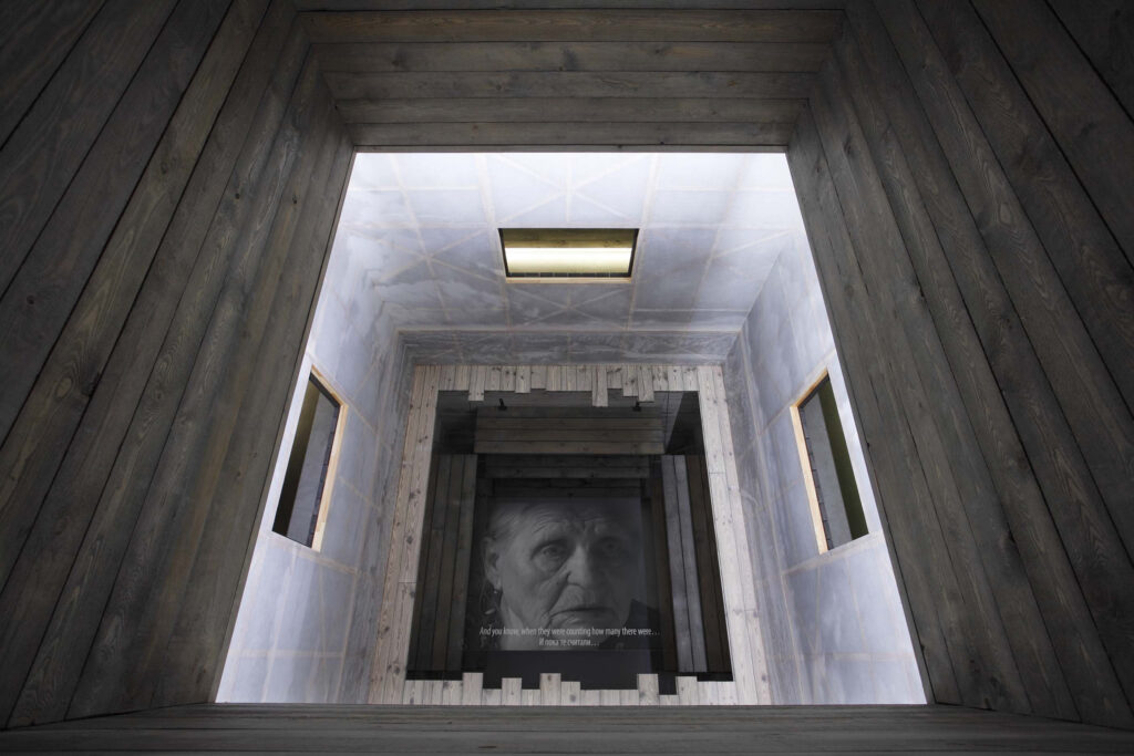 Varbūt man nevajag aprakstīt objektu, bet gan mēģināt aprakstīt domu vai ideju. Galu galā domas ir daudz tuvākas manai profesionālajai darbībai – režijai un scenāriju rakstīšanai. Es dodos lejā uz pagrabu, kur mani sagaida uzraksts “Shoah”, ivrita vārds, kas nozīmē “katastrofa” vai “pilnīga iznīcība”. Pie tālākās sienas ekrānā tiek rādīts fragments no dokumentālās filmas “Valentīnas Freimanes stāsts”. Valentīna stāsta par to, kā padomju laikā saņēma Paula Šīmaņa grāmatu, kuras priekšvārdā minēts, ka tekstu pierakstījusi jauna ebreju meitene. Šis stāsts ir spilgti aprakstīts arī viņas pašas grāmatā “Ardievu, Atlantīda”, kur viņa raksta par to, kā kara beigās slēpās Paula Šīmaņa mājā un pierakstīja viņa memuārus.